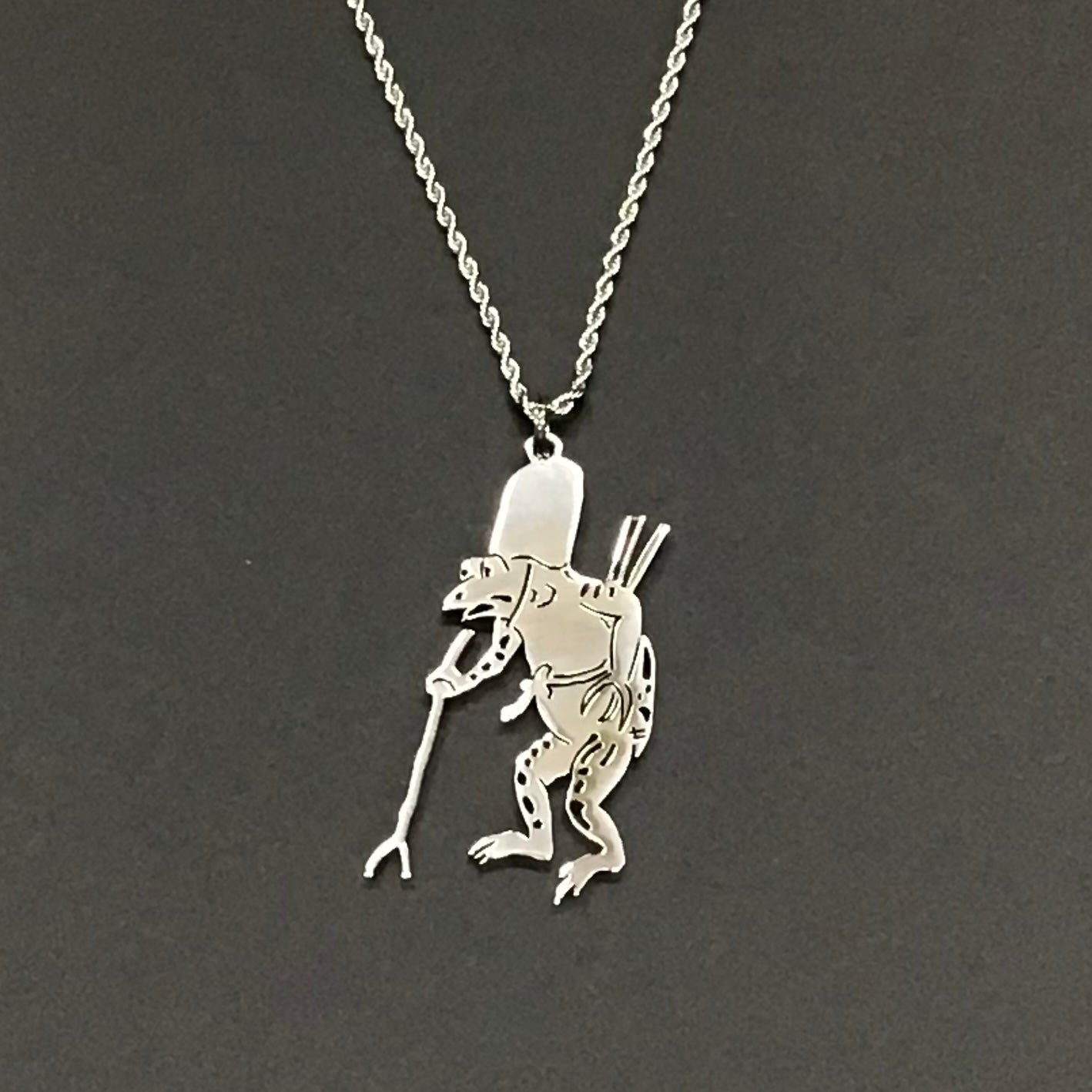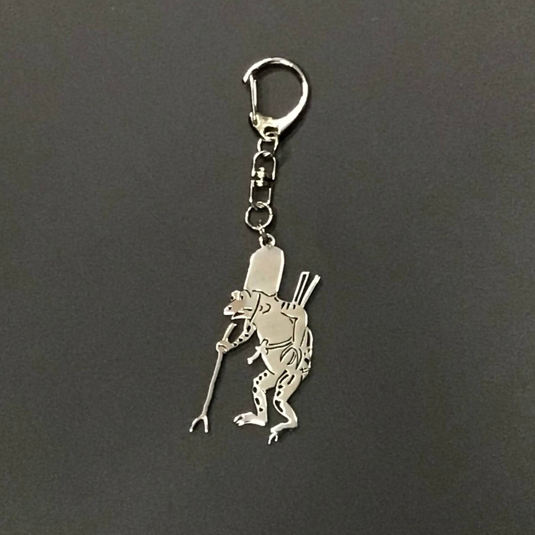 雅びやかに、そしてどこか愉快にーー烏帽子をちょこんと戴いた一匹の蛙が、千年の時を越え、metallicoの世界へと歩み出しました。本作は、国宝『鳥獣戯画』の甲巻に描かれた蛙をモチーフとしたステンレスチャームです。杖を手に、烏帽子をかぶって悠然と歩くその姿は、まるで平安貴族の行列に加わっているかのよう。雅やかな佇まいのなかに、どこかとぼけたような愛嬌とユーモアが潜み、見る人の心をふっと和ませてくれます。鳥獣戯画は、日本美術史上屈指の名品であり、動物たちが人間さながらに遊戯や儀式を繰り広げる様子を、滑らかな筆致で描いた絵巻。その中には、数多くのキャラクターが登場しますが、こちらの烏帽子蛙は、相撲などの有名な場面とは異なる、“知る人ぞ知る”極めて珍しい存在。アクセサリーチャームとしての登場も非常に稀で、まさに通好みのレアなモチーフといえます。隣を歩く烏帽子猫のステンレスチャームと並べれば、絵巻の一節がそのまま現代によみがえるよう。大人の感性をくすぐる遊び心にあふれた世界観を、手のひらサイズに閉じ込めました。このモチーフを、metallicoでは、2mm厚の高品質ステンレスを高精度レーザーで切り出し、熟練職人が一つひとつ丁寧に磨き上げて仕上げている国内一貫製作のジャパンメイド。金属の持つ静かな輝きと、線画のような繊細な造形が、鳥獣戯画の筆致をそのまま映し出すかのような存在感も魅力です。バッグチャームやネックレスとして、装いにさりげなく添えて、日常に品と遊び心を添える特別なアクセントにどうぞ。歴史や美術を愛する方への贈り物にも、稀有なデザインと趣がきっとお喜びいただける一品です。