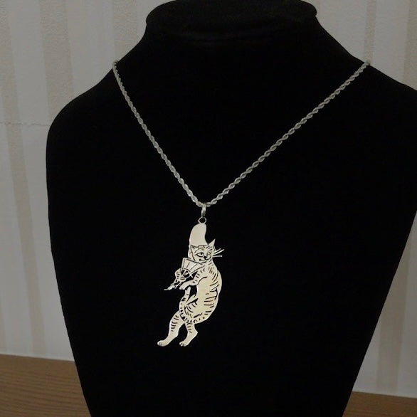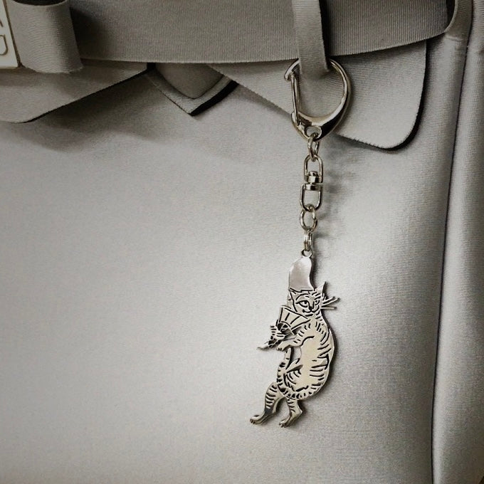 国宝【鳥獣戯画】をオマージュした傑作 、 metallico「鳥獣戯画シリーズ」から、一年ぶりとなる新作の登場です。今回の主役は、これまで人気を博してきた蛙や兎ではなく、甲巻後半にひっそりと現れる特別な存在、烏帽子をかぶり、扇を手にした一匹の猫、その名も【烏帽子猫(えぼしねこ)】です。 鳥獣戯画に描かれる数多くの動物の中で、猫はこの場面にしか登場せず、その希少さが際立ち、マニアの間では、ひそかに注目されている魅力的なキャラクターです。兎や蛙が軽やかに遊ぶ姿とは対照的に、烏帽子猫は、堂々と二本足で立ち、大きな瞳でこちらを見据える姿が麗しく印象的です。扇を掲げて、微笑むような仕草は、愛らしい猫らしさを漂わせながら、どこか平安貴族を思わせる雅やかさも備え、風流な魅力を放っています。 metallicoでは、このチャーミングで品格ある姿を、精密なレーザーカットと職人の仕上げ研磨により、唯一無二のステンレジュエリーへと仕上げました。縞模様の柔らかなシッポの曲線、独特な烏帽子の形状、扇の角度まで、細部にこだわって表現し、光にかざすと古絵巻の筆線が、まるで影絵のように浮かび上がります。千年の時を経た筆致と、現代の金属工芸が響き合う、時代を超えた風流な造形美を、お楽しみいただける一品です。ちなみに鳥獣戯画は、右から左へと読み進める絵巻で、「日本最古の漫画」とも称されます。その甲巻後半には、猿の盗人騒ぎや弔いの行列など、人間味あふれる場面が続きますが、そんな多様なドラマの中に、ふと一度だけ登場する烏帽子猫は、物語全体に小さなユーモアと不思議な余韻を添えています。展覧会等でも注目を集めたとの理由は、この烏帽子猫の持つ“特別感”にあるのかもしれません。千年の絵巻から飛び出した雅やかな猫を、身につけるジャパンラグジュアリー。扇の影でほくそ笑むような姿が、あなたの日常にそっと雅と遊び心を添えてくれることでしょう。
