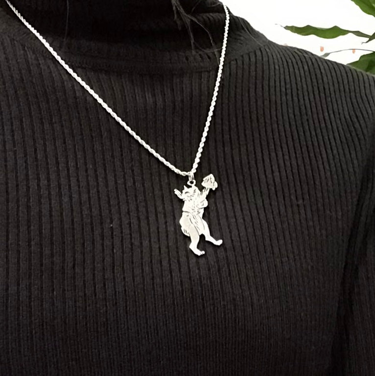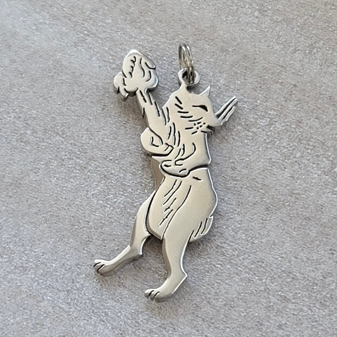 日本美術史に名高い国宝「鳥獣戯画」(平安時代絵巻)。その甲巻に描かれた狐の一場面。夜の静けさのなか、狐が狐火で的を照らし、「的当て」を楽しむ姿をモチーフにしたチャームです。狐火(きつねび)は、古くから日本で、夜をやさしく照らす不思議な光として親しまれてきました。鳥獣戯画の狐は、愛嬌と機知を感じさせる存在として描かれ、その姿には、知恵や遊び心、軽やかな吉兆がにじみます。描かれている「的当て」は、平安時代には新年や祝儀の場で行われた、縁起のよい行事のひとつです。的を射ることは、邪を祓い、運をひらき、一年を健やかに過ごす願いを込めた所作とされていました。「鳥獣戯画」では、そうした改まった行事を、動物たちの戯れとして描くことで、祝意をやさしく、ユーモラスに伝えています。本作では、狐のしなやかな輪郭、揺らめく狐火を、厚さ2mmのステンレスにレーザーカットで精緻に表現。硬質な素材に極細の線や小さな抜きを施すため、高い設計精度と職人の確かな技術が欠かせません。国宝に描かれた縁起の場面を、現代の金属加工でかたちにした一品です。鳥獣戯画を愛する方はもちろん、新しい年のはじまりや、節目の贈り物としてもふさわしい、鳥獣戯画ならではの縁起物です。